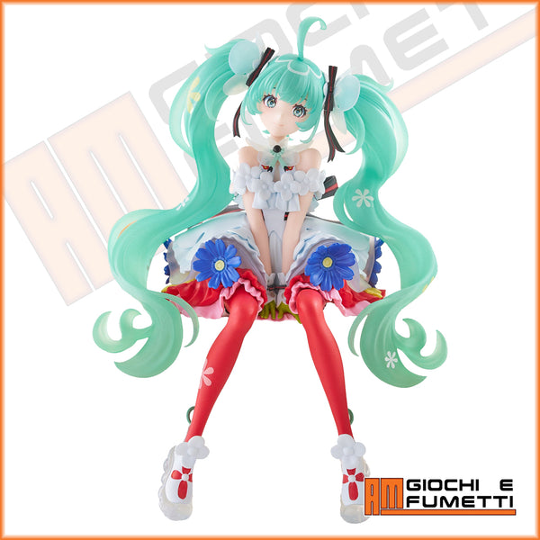 Hatsune Miku è raffigurata in una posa vivace ed elegante, con un outfit scenico ricco di dettagli floreali che richiama il tema “Blooming”. I colori brillanti, i capelli turchesi scolpiti con fluidità e l’espressione solare trasmettono tutta l’energia e la magia delle sue performance live.
